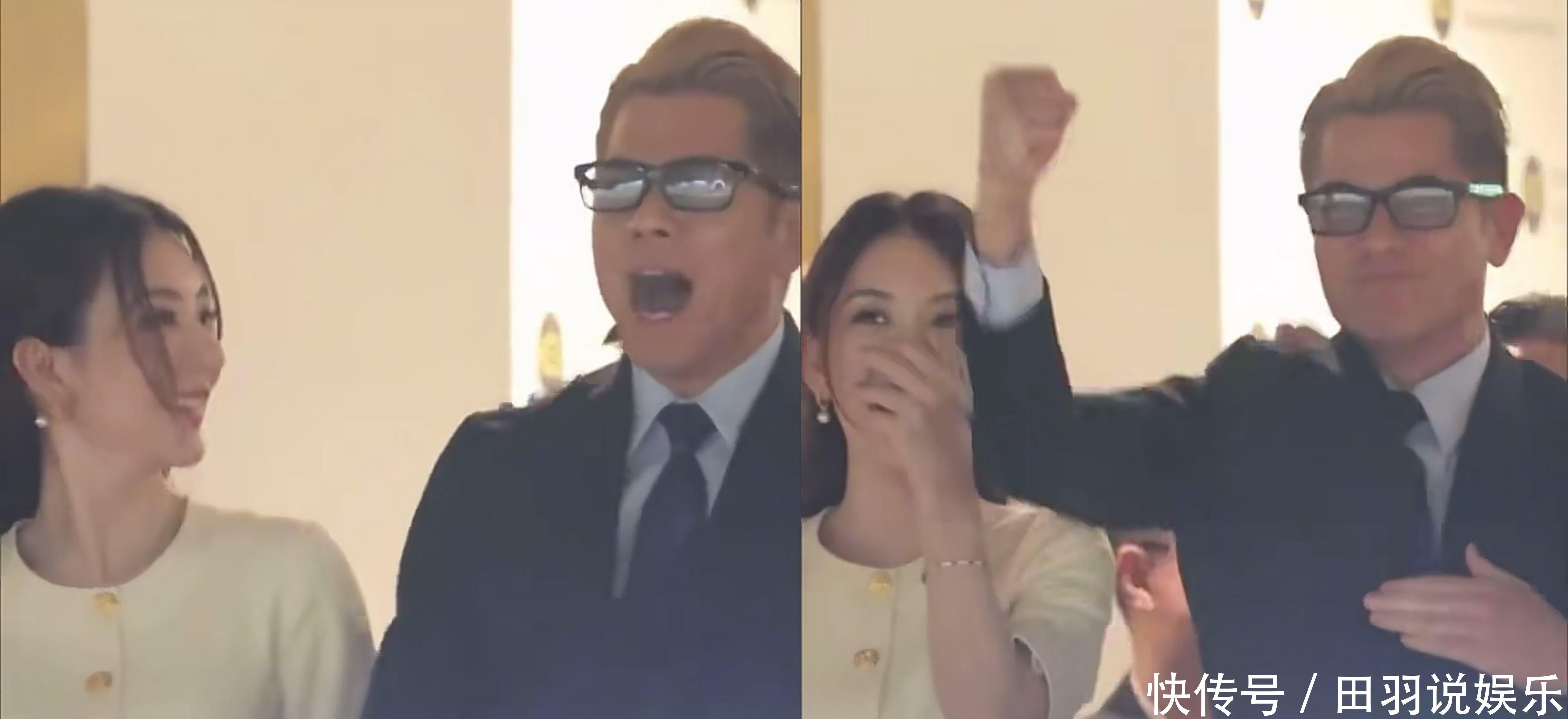 两个人在观看比赛的时候,开始郭富城还比较严肃,当看到自己的爱驹“舞林密码”夺得冠军之后,郭富城和老婆方媛开心鼓掌,并且激动相拥在一起!郭富城也感谢老婆和BB带来好运!